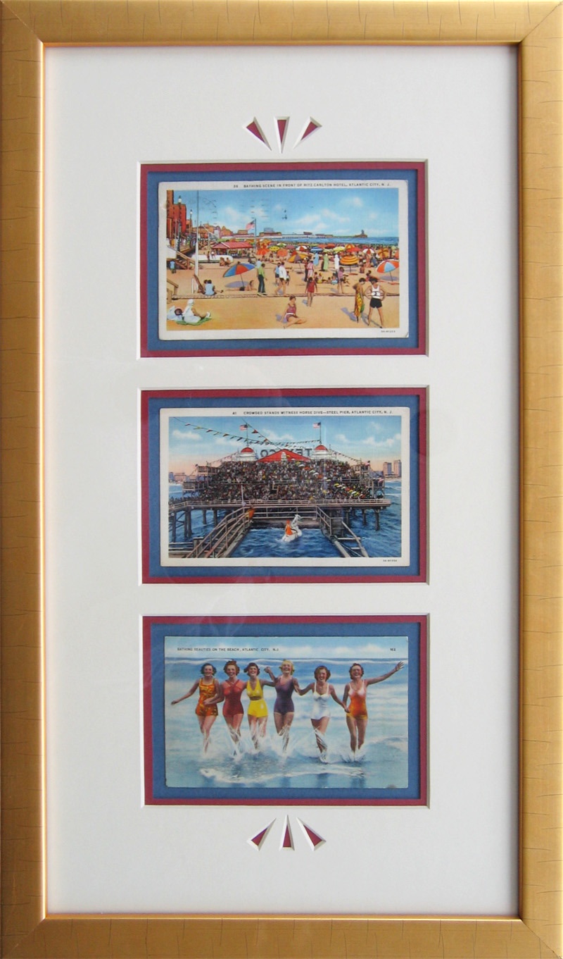 A trio of vintage Atlantic City, New Jersey postcards custom framed.